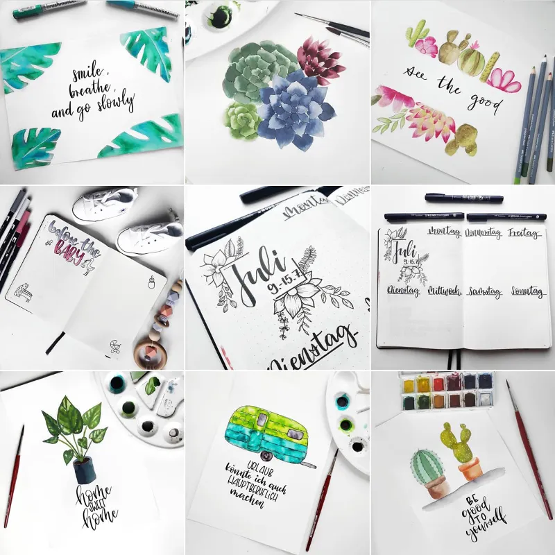 Annas Account vereint diese beiden Themenbereiche perfekt miteinander. Sie zeigt regelmäßig Seiten ihres eignen Bullet Journals, es ist aber auch viel Raum für Aquarellmalereien und Lettering in ihrem Feed. Eine wunderbare Mischung aus Illustrationen und BuJos.