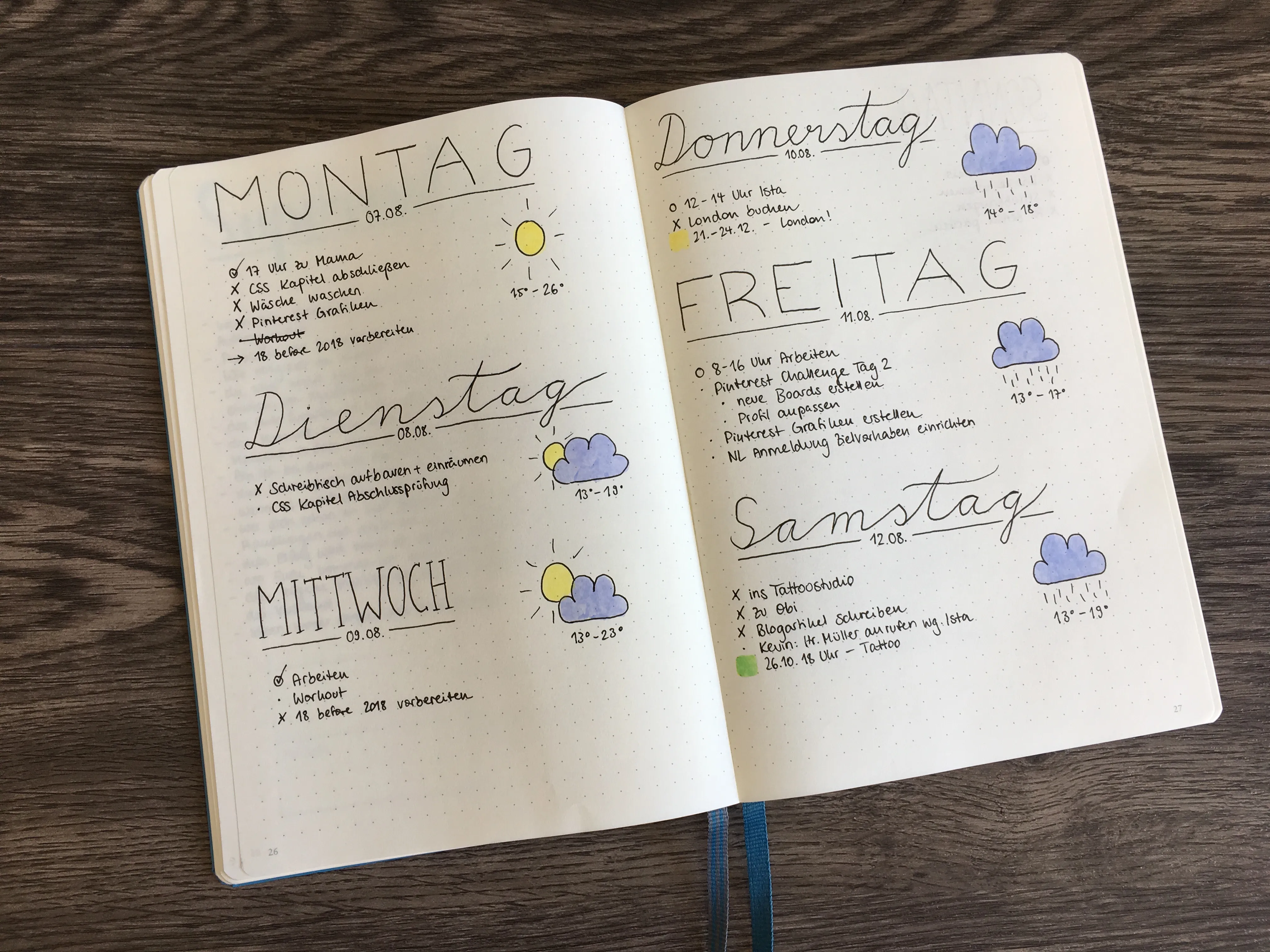 Im originalen Bullet Journal System wird der Wochentag und das Datum ganz minimalistisch als Überschrift verwendet. Wie das aussehen kann, siehst du links auf dem Foto.