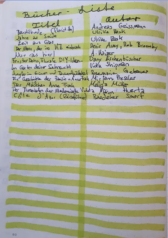 Da ich die Reading Challenge von Punktkariert mitmache, ist es logisch, dass in meinem BuJo eine Bücherliste nicht fehlen darf. So habe ich den optimalen Überblick, welche Bücher ich bereits gelesen habe.