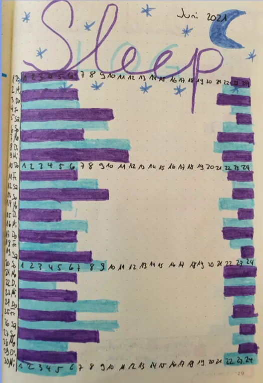 Im Sleep Log zeichne ich ein, wann ich geschlafen habe. Da ich das aufgrund meiner Schlafstörungen eh festhalten muss, war für mich klar: ein Sleep Log muss in mein BuJo. Den Sleep Log gestalte ich immer in den Farben Blau/violett, unabhängig vom Monatsthema.