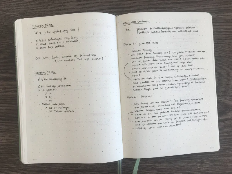 Für diese Journaling-Einträge nutze ich auch einfach immer die nächste freie Seite. Das gleiche gilt für Notizen: Für einen meiner Newsletter habe ich z.B. eine Umfrage erstellt. Bevor ich das am Laptop umsetze, habe ich erstmal alle Fragen dafür im Bullet Journal festgehalten: