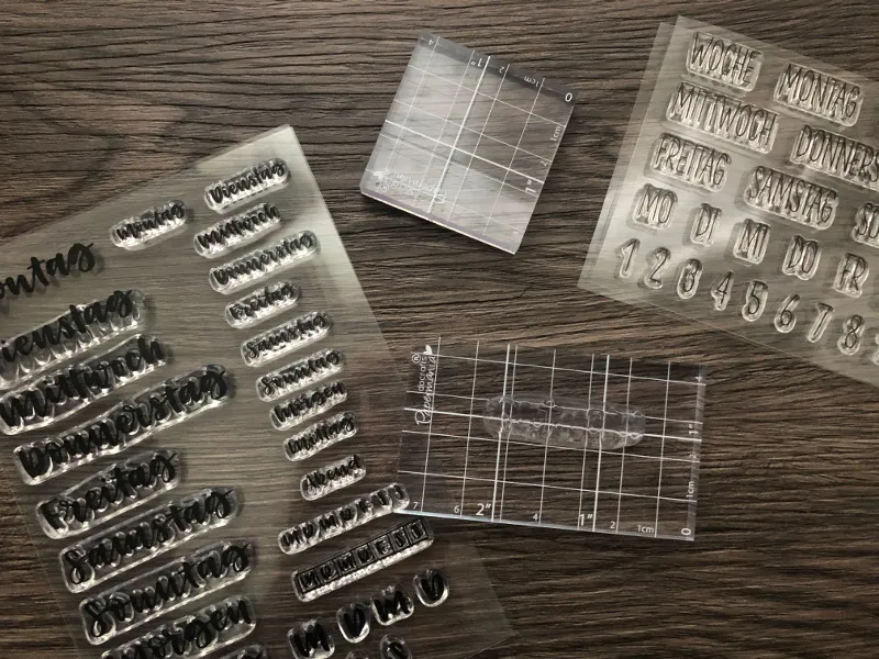 Besonders gut geeignet fürs Bullet Journal sind Stempel aus Silikon, die mit einen Stempelblock benutzt werden. Der Vorteil: Sie sind komplett durchsichtig, sodass du immer genau siehst, wo genau du die einzelnen Worte oder Zahlen platzierst. Viele Stempelblöcke haben zudem aufgemalte Hilfslinien, die das Ausrichten noch zusätzlich erleichtert. Die Stempel sind selbstklebend und nach dem Gebrauch wieder ganz leicht ablösbar.