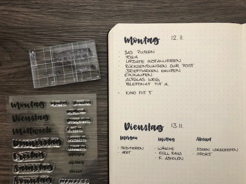 Auf dem folgenden Bild siehst du meine typischen Tagesübersichten, in denen ich meine täglichen Aufgaben und To Dos notiere. Für diese Seite habe ich die Stempel im Kalligraphie-Design gewählt, sodass der Kontrast zwischen Überschrift und selbstgeschriebenen Aufgaben noch größer ist.
