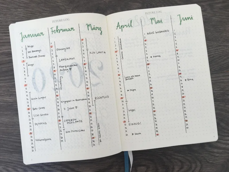In meinem Setup für 2020 habe ich es kurz erwähnt: Da ich den Future Log eh nicht als Kalender nutze (den hab ich digital), wollte ich es mal ausprobieren, die Übersicht eher rückwirkend zu füllen, mit allem was so passiert ist.