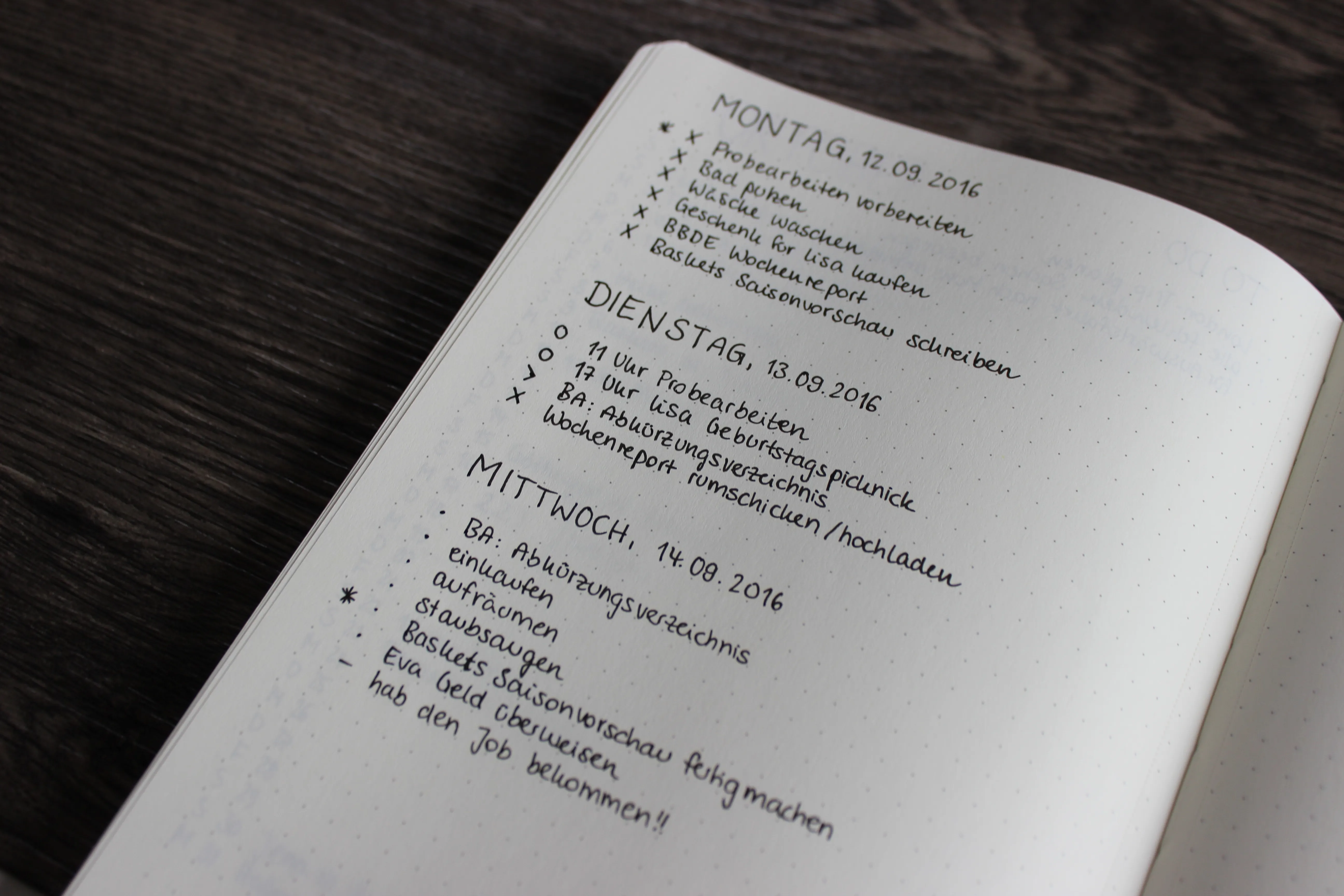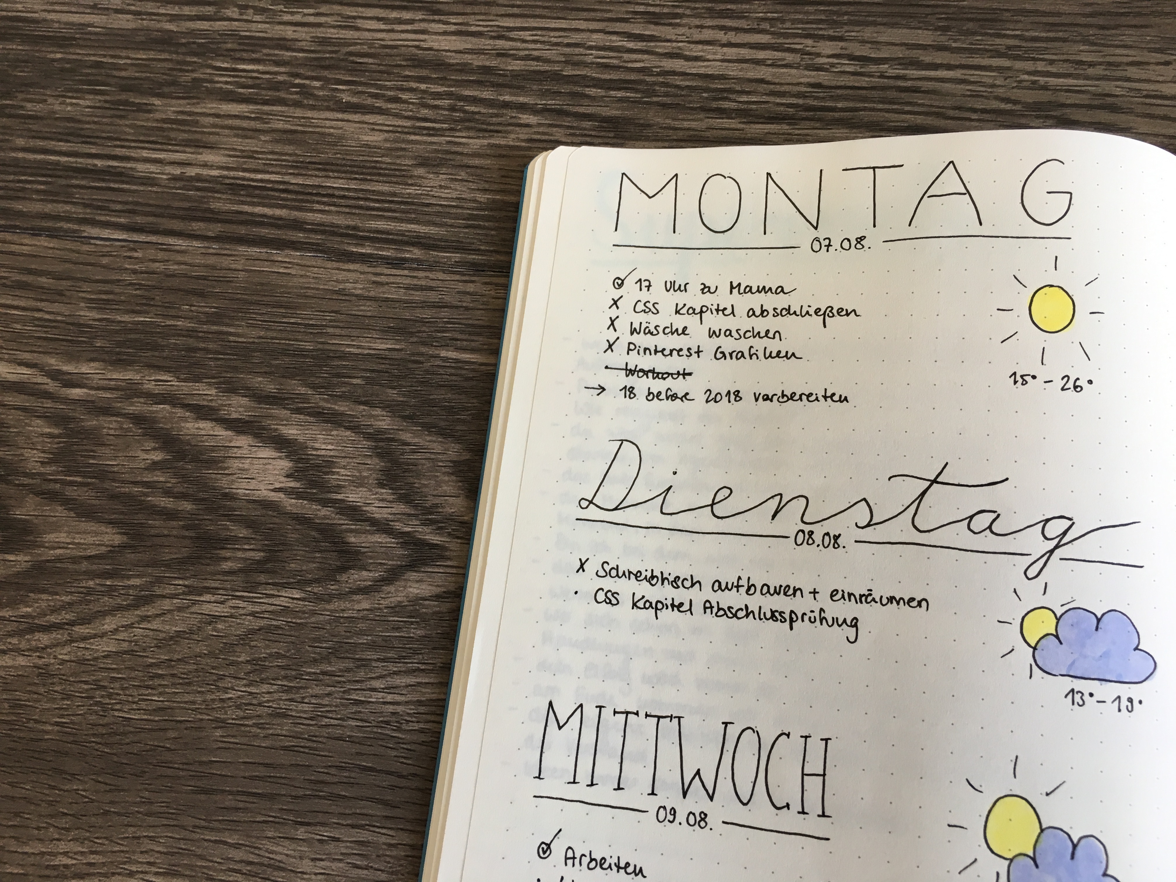 Im originalen Bullet Journal System wird der Wochentag und das Datum ganz minimalistisch als Überschrift verwendet. Wie das aussehen kann, siehst du links auf dem Foto.