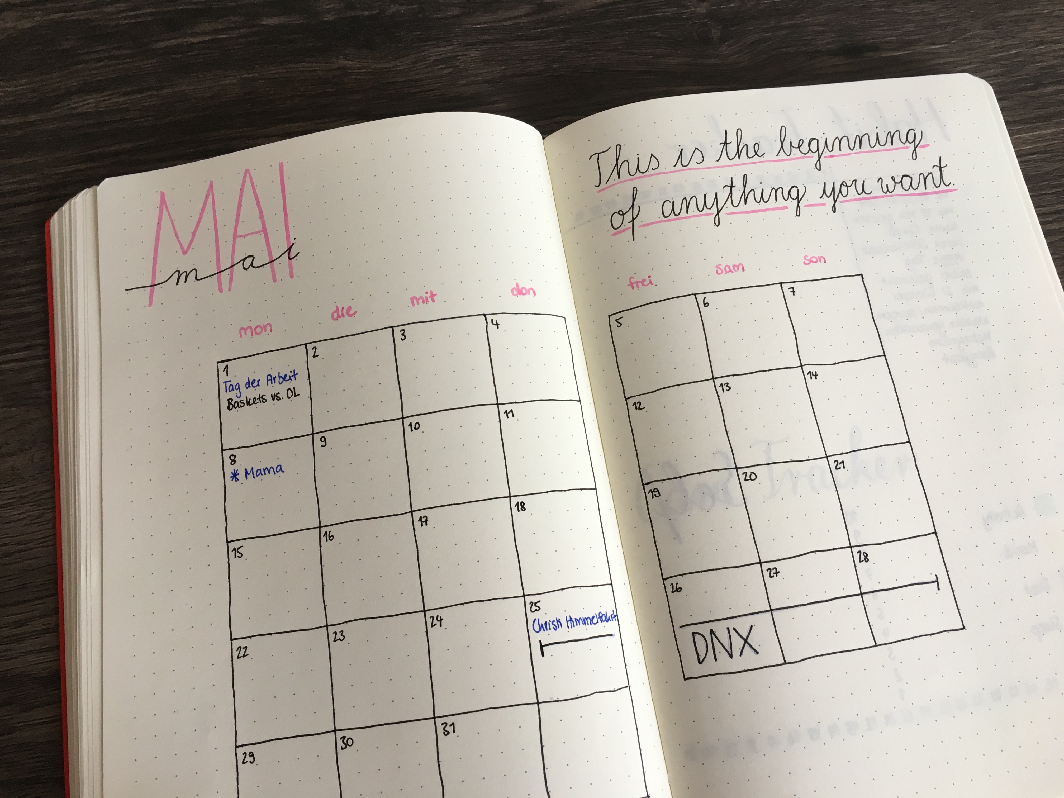 Der April geht jetzt noch eine Woche, allerdings habe ich jetzt schon meine Monatsübersicht Mai ins Bullet Journal eingetragen. Das mache ich eigentlich recht ungerne. Es ist relativ schwierig einzuschätzen, wie viel Platz ich für die letzte April-Woche noch brauche. Und ich mag es gar nicht, zu viel oder zu wenig Platz zu haben!