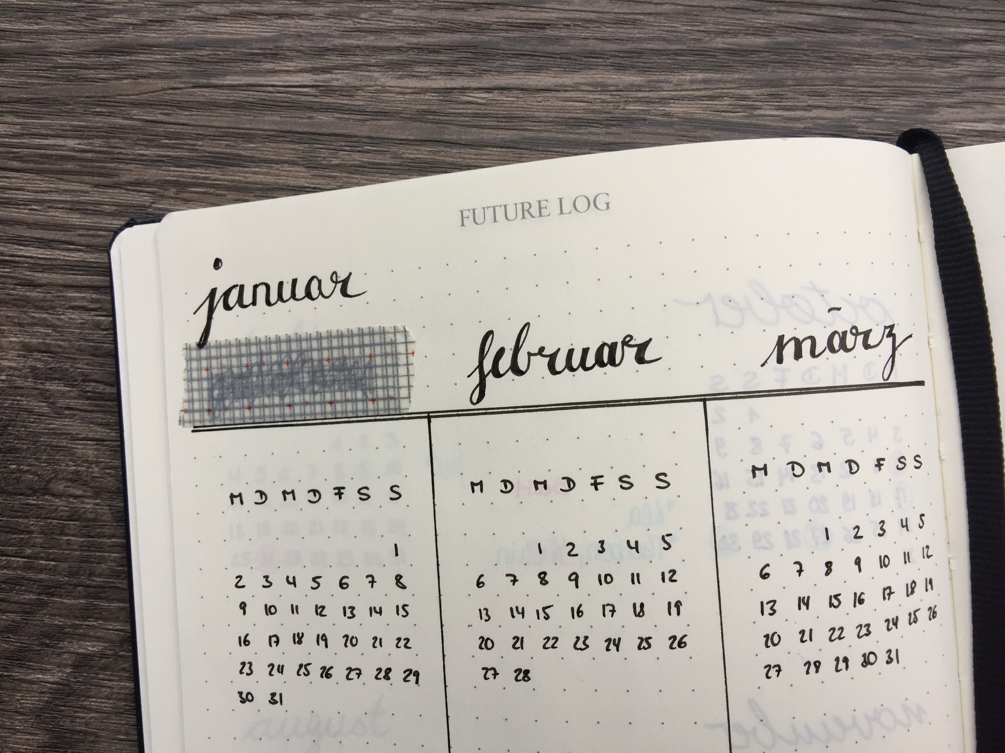 Die danach angeordneten vier Seiten des Future Logs enhalten die entsprechende Überschrift, sind aber ansonsten neutral gehalten. Wie auf dem Bild zu sehen ist, habe ich dort jeweils drei Monatsübersichten auf einer Seite untergebracht. Nur echt mit Schreibfehler :) Auf der nummerierten Seite 5 beginnen dann die völlig freien punktkarierten Blätter.