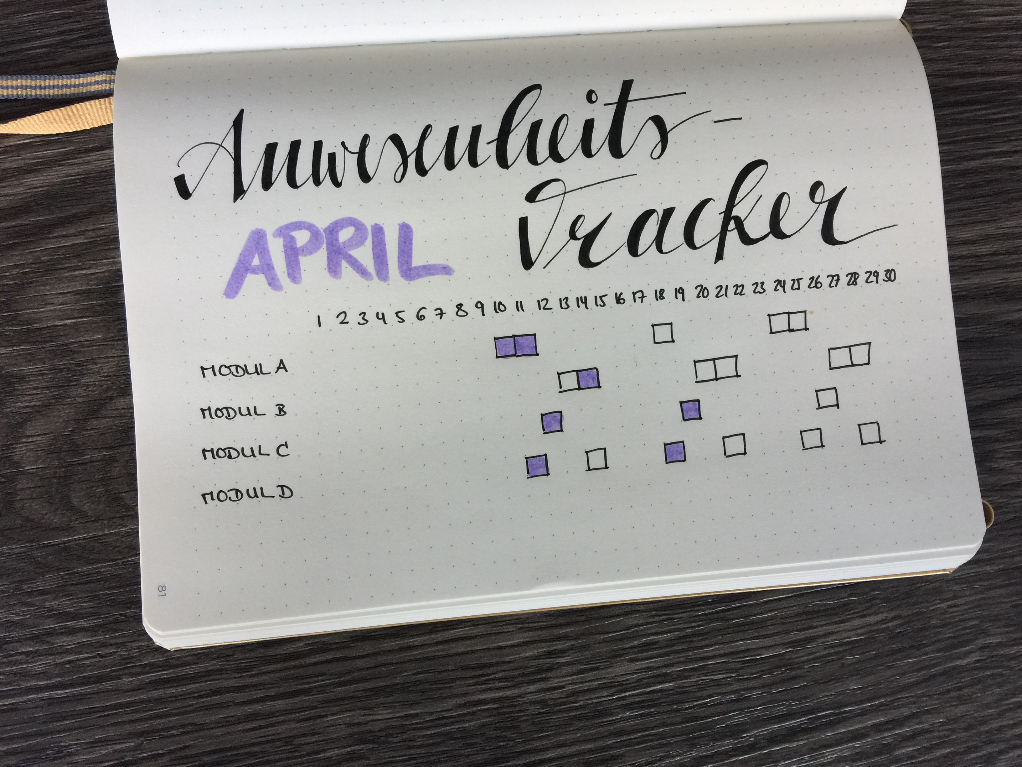 Das Prinzip ist im Endeffekt das gleiche wie das des Habit Trackers. Am linken Rand habe ich als Beispiel untereinander die verschiedenen Module aufgelistet, die ich dieses Semester absolvieren möchte. Darüber notiere ich horizontal die Tage des Monats. Im Gegensatz zum Habit Tracker ist der Anspruch hier aber nicht, jeden Tag ein Kästchen abzuhaken, da die Veranstaltungen nur an einzelnen Tagen in der Woche stattfinden.