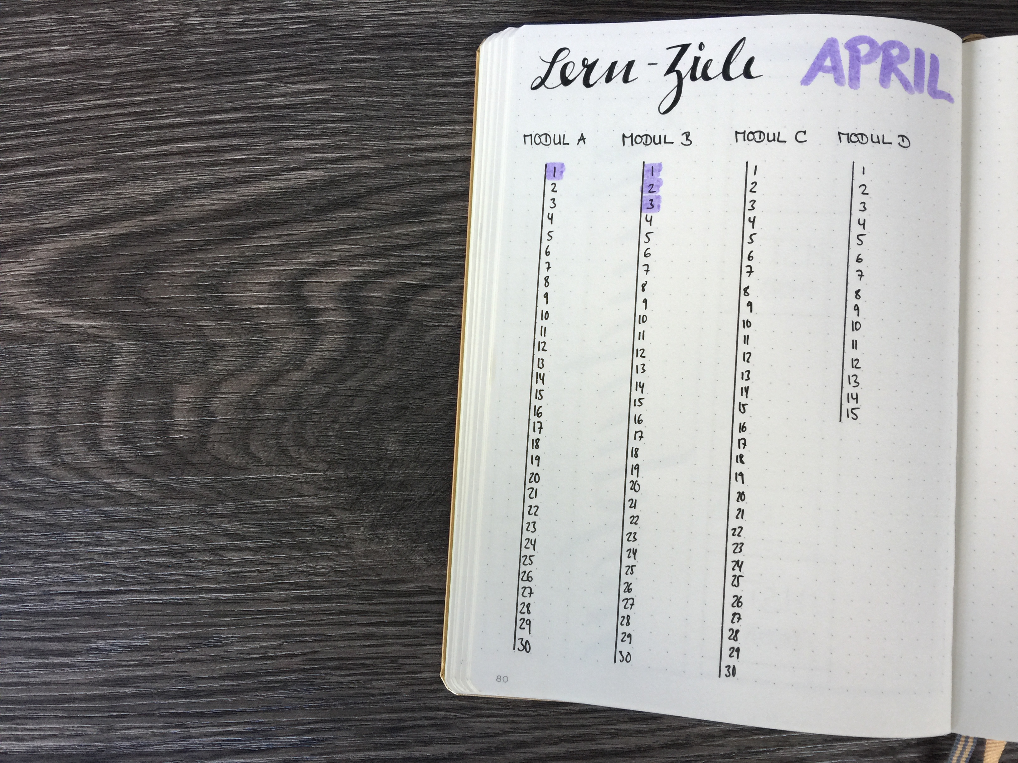 Ich habe mir also überlegt, wie viele Stunden ich mich pro Monat mit den einzelnen Modulen beschäftigen möchte. Diese habe ich dann in Listenform untereinander geschrieben. In diesem Fall möchte ich somit für die Module A, B und C 30 Stunden investieren, für Modul D werden wohl 15 reichen.