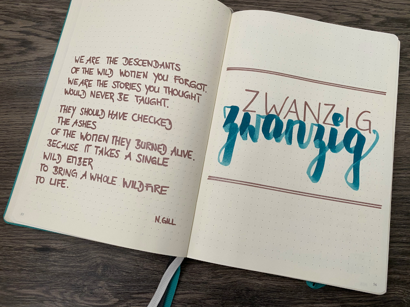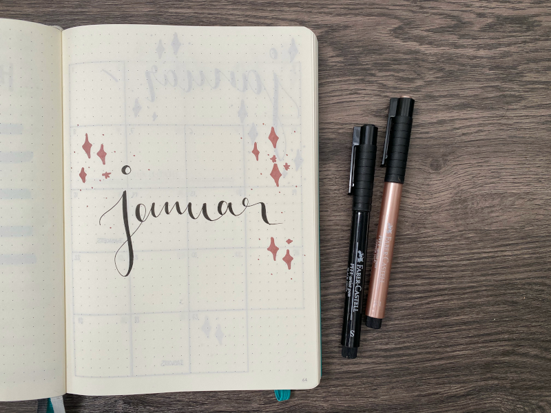 Mein Bullet Journal ist zwar weitestgehend nach dem originalen System aufgebaut, enthält aber auch immer viel Farbe und große Schriftzüge. Mein Deckblatt für das kommende Jahr besteht aus solch einem Schriftzug, inspiriert von unseren Jahresend-Workshops und Leas Ideen für die ersten Seiten.
