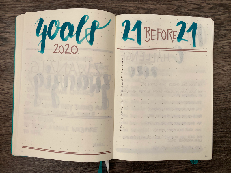 An das Deckblatt schließen sich dann direkt zwei Seiten an, die etwas mit Zielen zu tun haben. Rechts ist Platz für eine Liste an 21 Dingen, die ich gerne vor 2021 tun, erleben oder erreichen möchte. Daher der Name “21 before 21”.