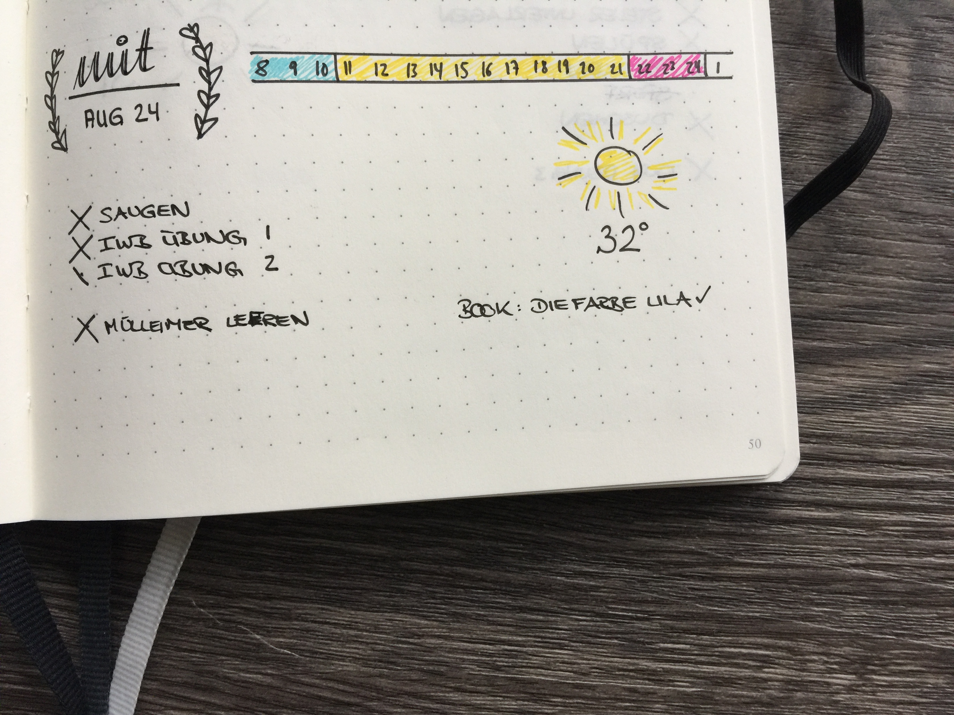 Ganz simpel. Ich schaue jeden Abend in die Wetter-App vom iPhone und male dann das entsprechende “Icon” (also meistens eine Wolke). Außerdem schreibe ich noch auf, wie viel Grad es wird. Ich finde es ganz gut, grob zu wissen, wie das Wetter wird, deswegen mache ich das sehr gerne so.