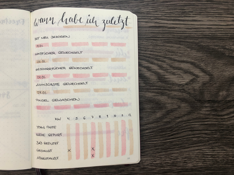 Ein weiterer Tracker, den ich sehr praktisch finde, ist der Haushalt Tracker. Dabei kannst du einfach alles aufführen, was im und um das Haus so anfällt und regelmäßig erledigt werden muss. Das können Dinge sein wie zum Beispiel das Bad oder den Boden putzen, Wäsche waschen oder bügeln. So siehst du direkt auf einen Blick, wann du zuletzt das Bett neu bezogen oder die Handtücher gewechselt hast.