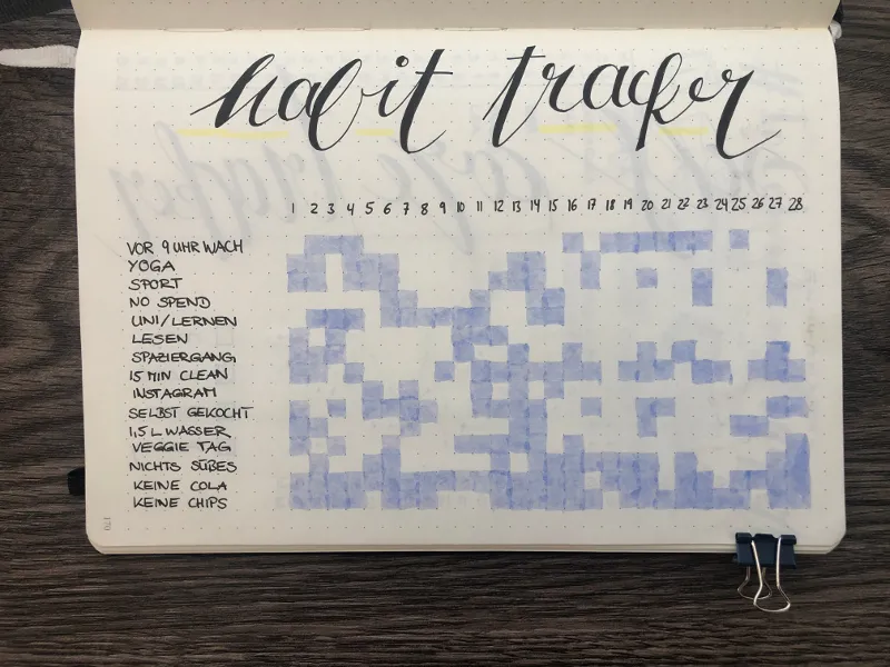 Mein wichtigster Bullet Journal Tracker ist der sogenannte Habit Tracker. Um diesen anzulegen überlegst du dir zu Beginn eines jeden Monats, welche Dinge du gerne täglich erledigen oder schaffen möchtest. All diese Sachen schreibst du dann quer untereinander auf eine freie Seite in deinem Journal. Darüber kommen die einzelnen Tage des Monats und schon hast du deinen ersten Bullet Journal Tracker erstellt.