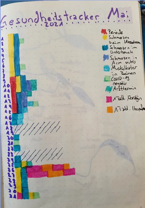 Auch für diesen Tracker erstelle ich eine Legende, in der ich alle Farben und ihre Bedeutung notiere. An einem Tag, an dem alles bestens war, mache ich mit einem Fineliner diagonale Striche.