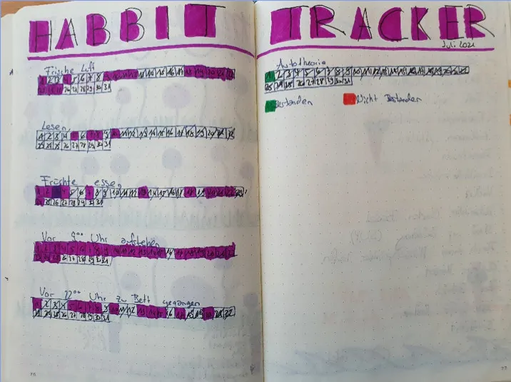 Genau wie der Mood Tracker sind auch Habit Tracker für das Bullet Journal sehr bekannt! Dort notiere ich mir Ziele und Gewohnheiten, die ich mir aneignen möchte. So kann ich am Ende des Monats sehen, was ich wie oft erreicht habe.