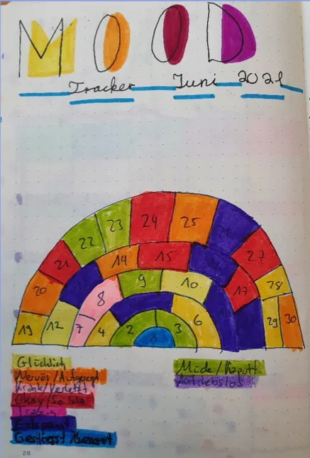 Ich denke, jeder von euch weiß, was ein Mood Tracker ist. Ich gestalte den Mood Tracker immer passend zum Monatsthema. Im Juni war das Thema Regenbogen, da habe ich passend dazu die Umrissform eines Regenbogens gezeichnet und ihn dann in 30 Teile aufgeteilt.