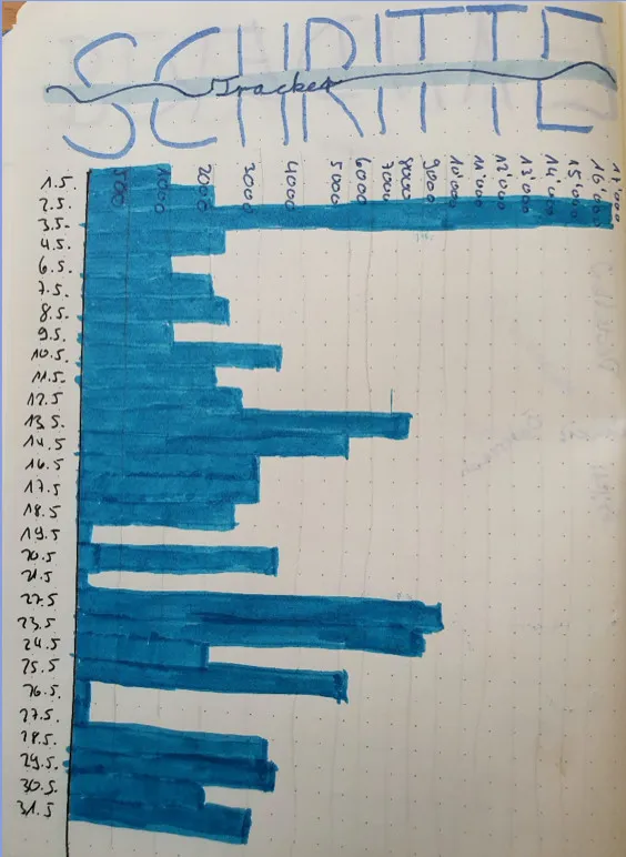 Auf dem Handy habe ich eine Gesundheitsapp installiert, die unter anderem meine Schritte zählt. Am Abend übertrage ich diese Anzahl in mein BuJo. Da ich mein Handy während der Arbeitszeit immer in meinem Spind habe, ist das Ergebnis ein bisschen verfälscht, da ich während der Arbeit meist sehr viel umherlaufe.