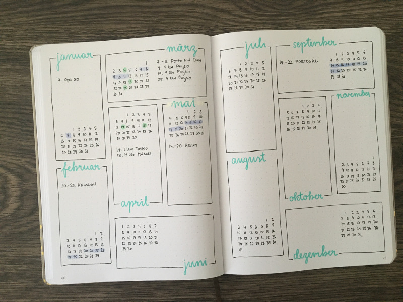 Ich finde es aber immer sehr praktisch, diese ganz vorne im Bullet Journal zu haben. Designtechnisch hast du hier nicht so wahnsinnig viele Möglichkeiten, da die Monate an sich einfach schon recht viel Platz einnehmen.