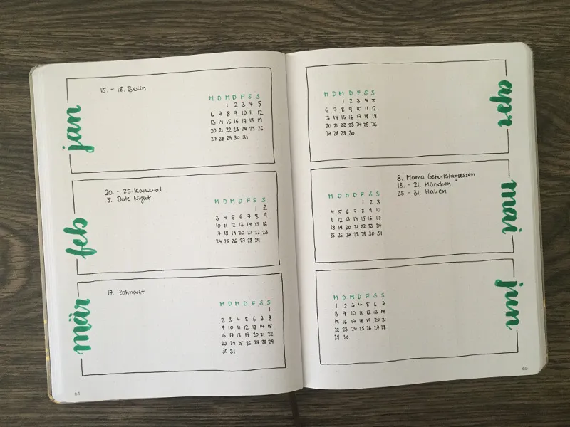 Hier hast du nämlich 12 Kästchen auf einer Doppelseite, eines für jeden Monat, und kannst deine Termine passend eintragen. Mehr Platz hast du natürlich dann, wenn du die mini Kalender weglässt.