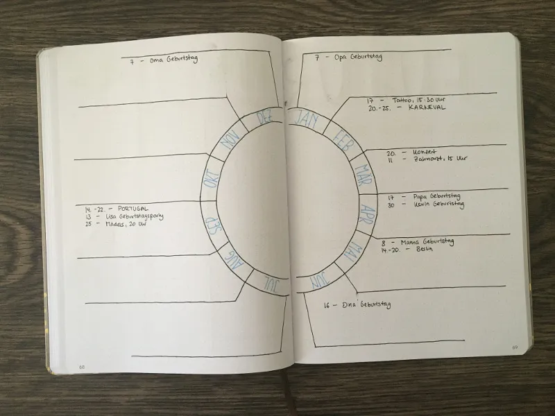 Kommen wir zu einer etwas ausgefalleneren Version des Future Logs! Hier hast du einen Kreis mit allen 12 Monaten des Jahres, von dem dann die Striche wie eine Art Spinnennetz abgehen - hier kannst du deine Termine eintragen.