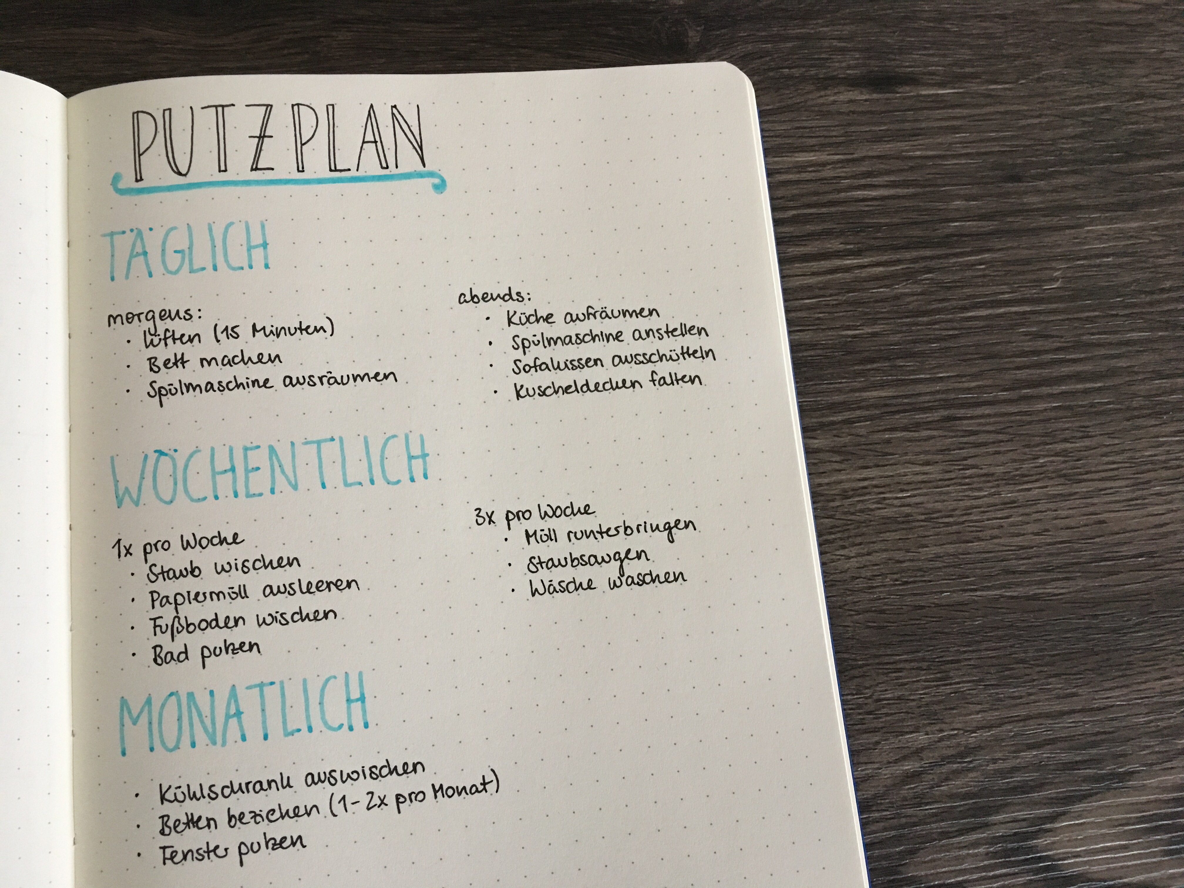 Sich am Anfang erst einmal einen Überblick zu verschaffen, was wie regelmäßig gemacht werden muss, kann schon viel ausmachen. Dann musst du einfach herausfinden, was für ein Typ du bist: reicht es dir zu wissen, wann du das letzte Mal das Bad geputzt hast, um es dann im nötigen Abstand wieder zu putzen? Oder musst du genau planen, wann du was machst?
