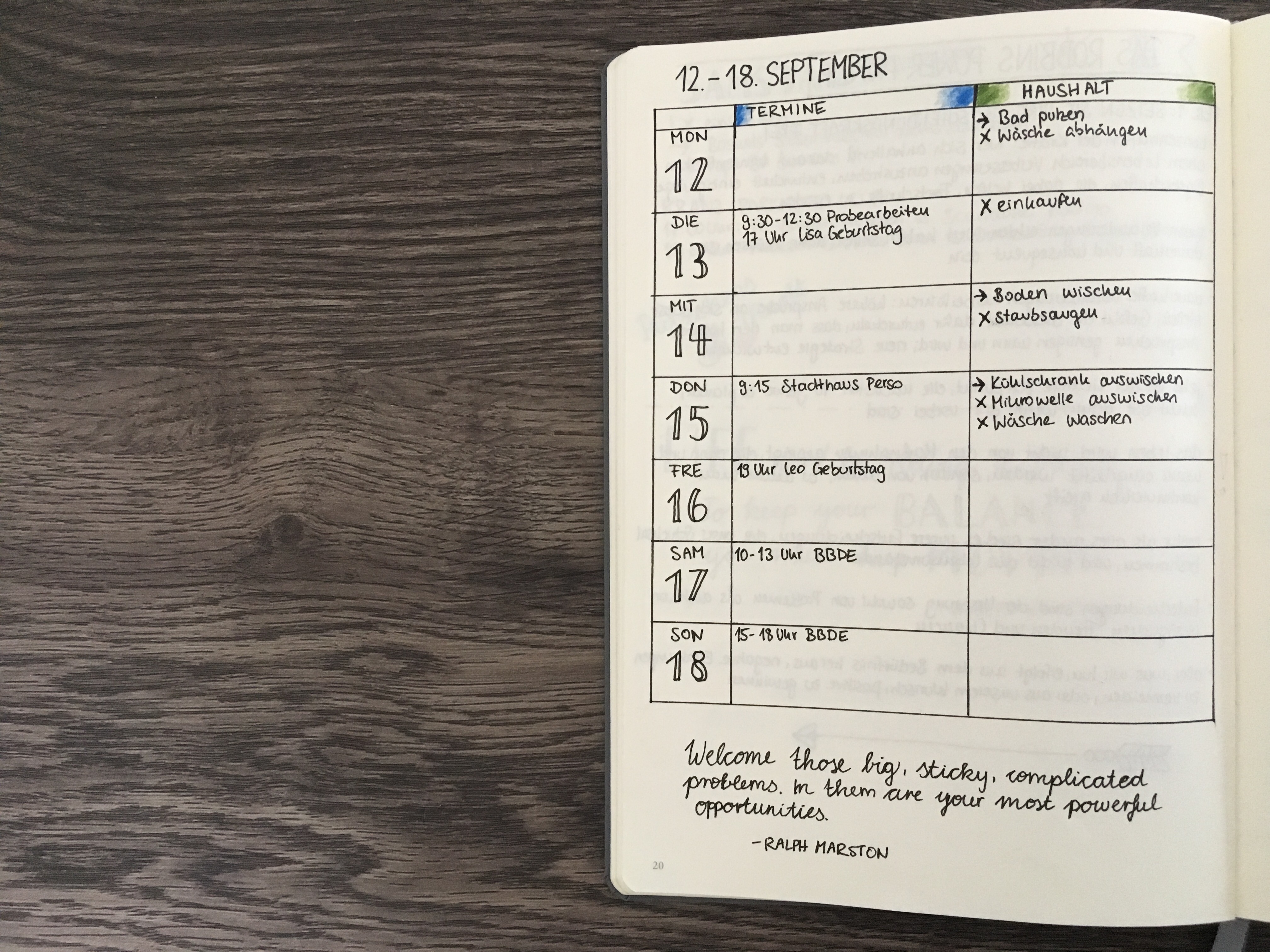Du kannst daher auch überlegen, deine Haushaltsplanung in deine Wochenübersicht zu integrieren. Das kannst du zum Beispiel so gestalten: