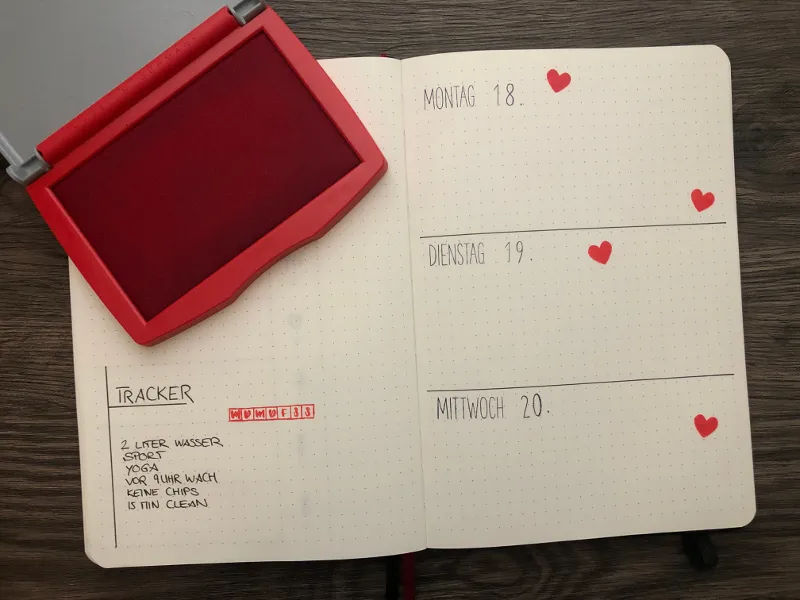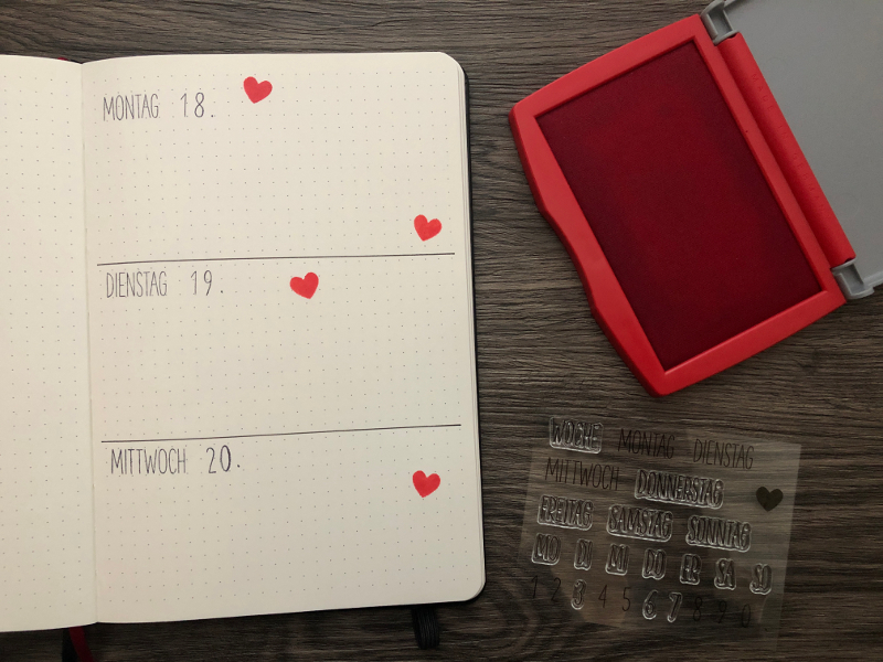 Eine weitere Möglichkeit für deine Tagesübersichten sind die etwas filigraneren Stempel aus meinem zweiten Set. Verziert habe ich diese Seite mit roten Herzen, die ebenfalls gestempelt sind.