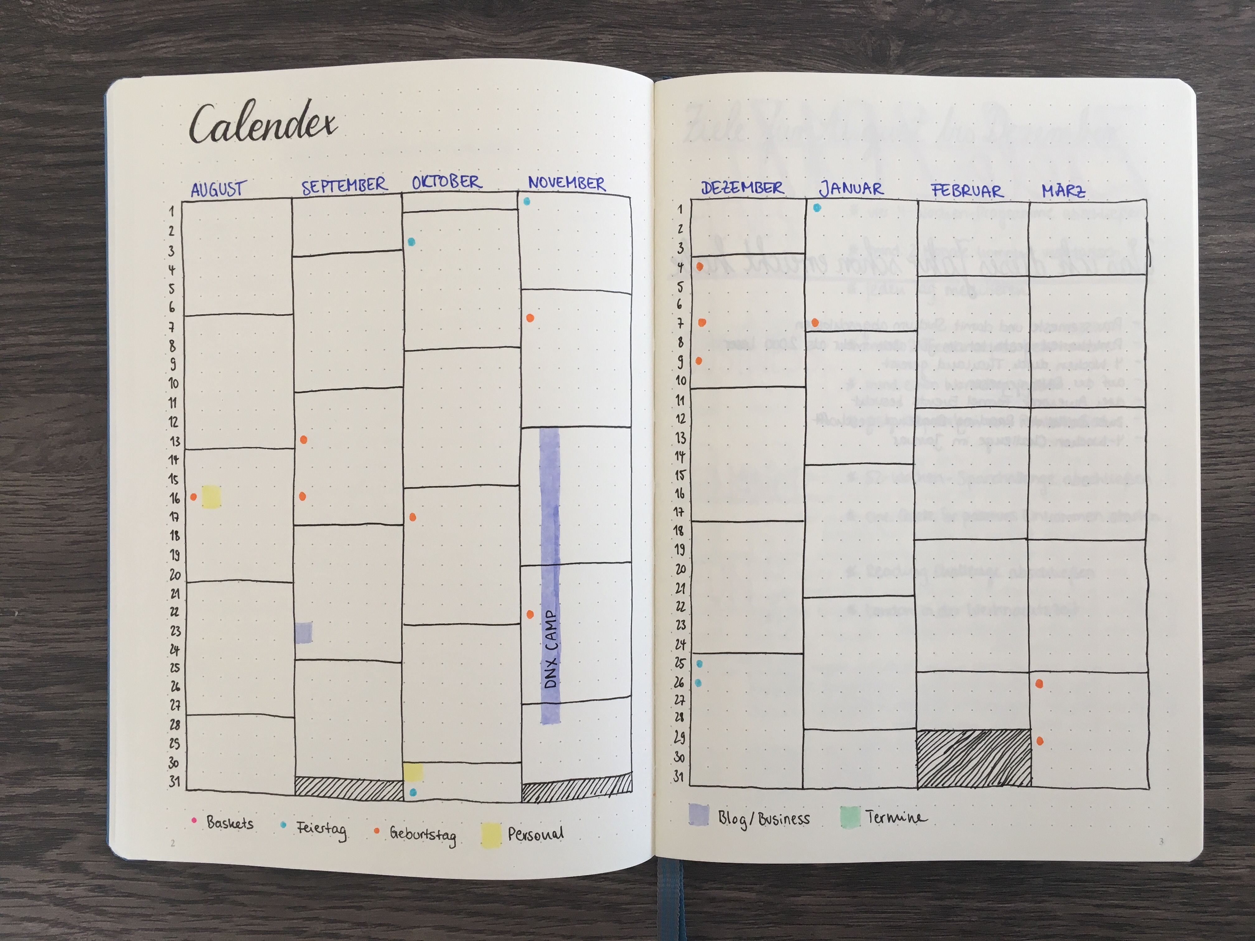 Dann folgt auch schon der Future Log. Hier habe ich mich wieder für einen Calendex entschieden, weil das für mich im letzten Bullet Journal sehr gut funktioniert hat. Wenn du wissen möchtest, wie genau dieser Calendex funktioniert, kannst du das hier nachlesen.