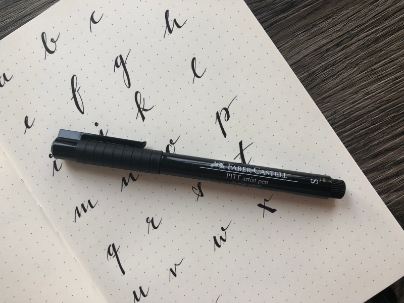 Ich benutze, wie für alle anderen Schreibarbeiten im Bullet Journal auch, die schwarzen PITT Artist Pens von Faber Castell. Für die ersten Schritte wähle ich immer den Stift in der Größe S, das ist gleichbedeutend mit der kleinsten Spitze im Set. Je nachdem wie groß die Buchstaben sind, die ich gerade zeichne, wechsle ich für das Ausmalen den Stift. Sind sie etwas größer, greife ich zu einer etwas dickeren Mine mit der Bezeichnung F.